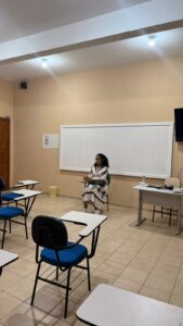 Durante o momento, a profissional compartilhou sua trajetória e experiências no serviço público, abordando a importância do fisioterapeuta no contexto das Equipes de Saúde da Família (ESF) e nas ações de promoção, prevenção e reabilitação em saúde. A troca foi marcada por uma conversa rica e dinâmica, que aproximou a vivência acadêmica da realidade do Sistema Único de Saúde (SUS).