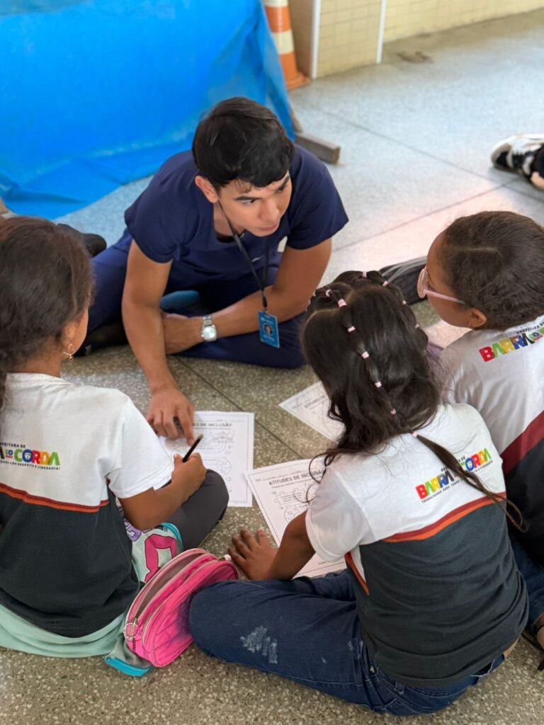 Dando continuidade à ação, os estudantes conduziram dinâmicas interativas que estimularam a participação ativa dos alunos e proporcionaram reflexões significativas sobre inclusão e convivência com as diferenças. As atividades favoreceram o desenvolvimento da empatia e reforçaram a importância de construir um ambiente escolar mais acolhedor para todos.