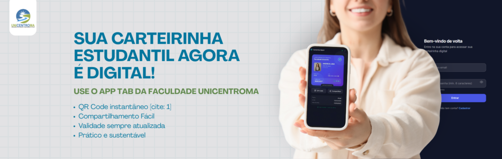 A Faculdade UnicentroMA dá mais um importante passo rumo à inovação tecnológica com o lançamento do Aplicativo Oficial da Carteirinha Estudantil Digital, uma ferramenta que traz mais praticidade, segurança e modernidade para a vida acadêmica dos seus alunos.
